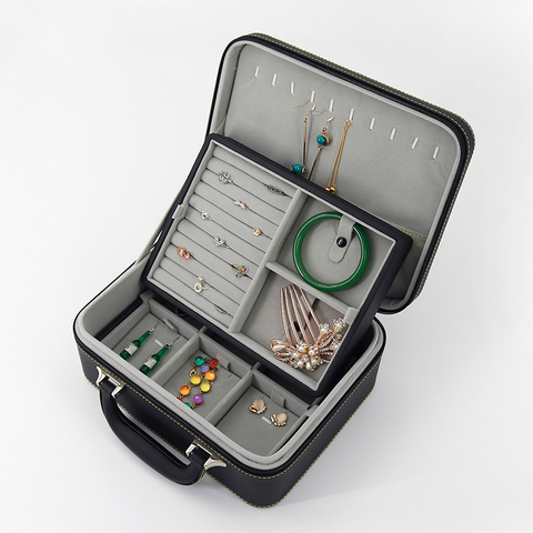 Siyah gri kişiselleştirilmiş büyük takı çantası büyük kapasiteli deri mücevher saklama kutusu